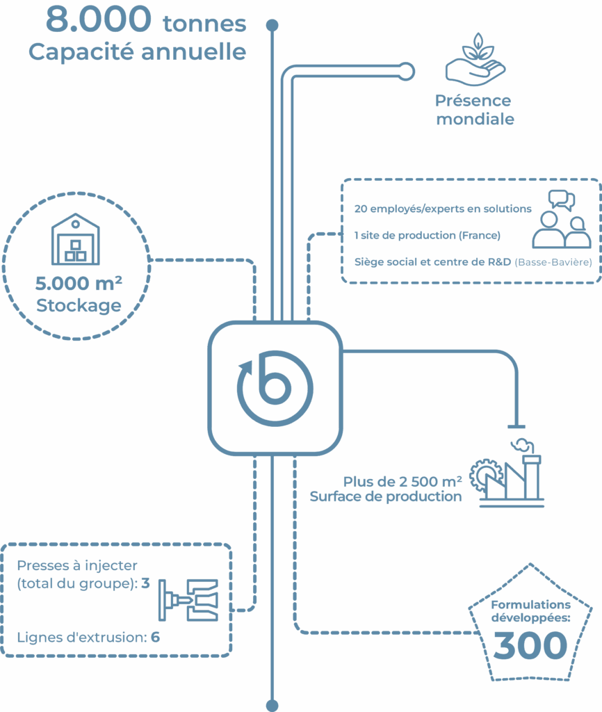 Depuis plus de 14 ans, nous développons et proposons des alternatives durables aux plastiques conventionnels à base purement fossile, contribuant ainsi de manière significative à la réduction des émissions de CO₂. Nous proposons à l'industrie des solutions plastiques sur mesure grâce à une étroite collaboration avec nos clients, des conseils avisés et une planification stratégique de la mise en œuvre, du choix des matériaux à la production. Nous garantissons ainsi à nos clients la plus grande valeur ajoutée et créons des plastiques écologiques, performants et économiquement viables pour un avenir durable.